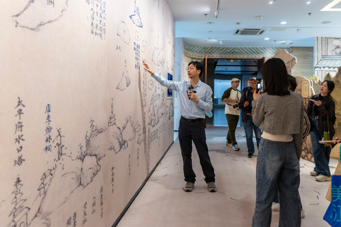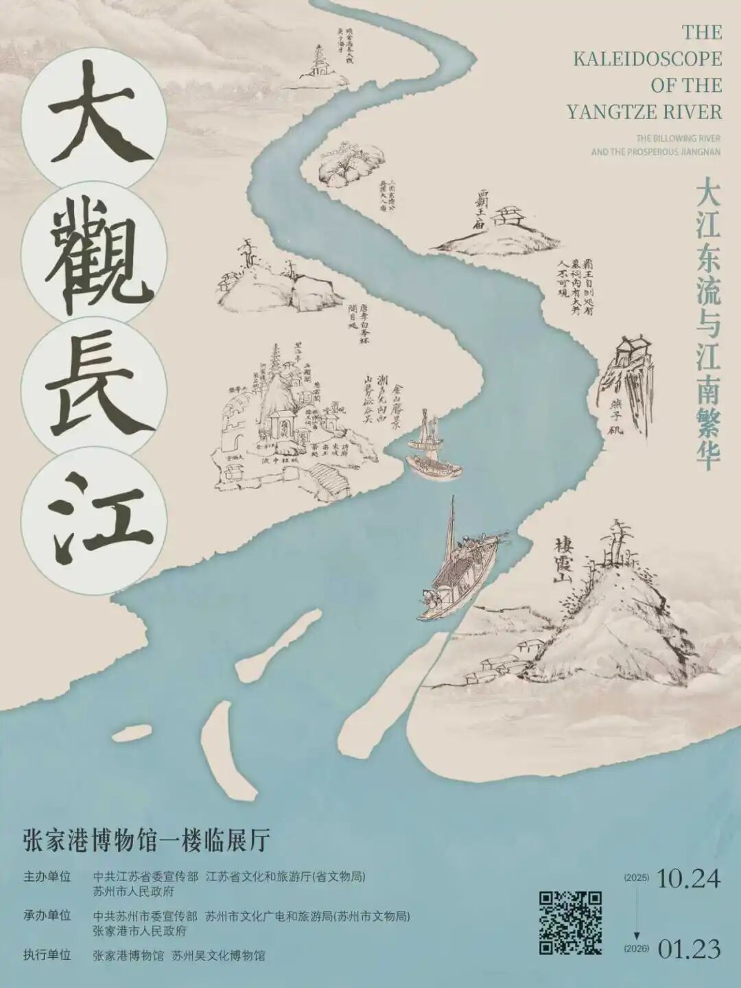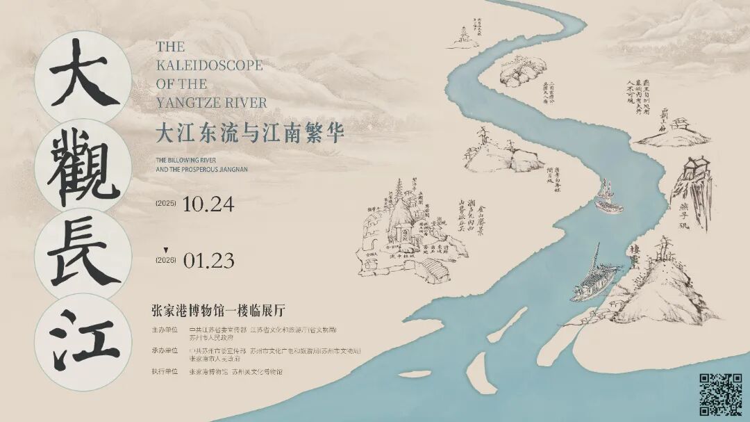 10月24日,由中共江苏省委宣传部、江苏省文化和旅游厅、苏州市人民政府主办,中共苏州市委宣传部、苏州市文化广电和旅游局、张家港市人民政府承办,张家港博物馆、苏州吴文化博物馆共同执行,金螳螂文化设计实施的“大观长江——大江东流与江南繁华”主题展览在张家港博物馆开幕。 本次特展是“考古里的长江文明”系列展览,也是2025长江文化节的系列活动之一。 (视频号) “考古里的长江文明”系列展览之“大观长江——大江东流与江南繁华”主题展览汇集来自中国国家图书馆、重庆中国三峡博物馆、安徽博物院、南京博物院等15家文博机构的159件(套)珍贵文物,包含吴王夫差剑、“偏将军”金印、大报恩寺狮纹琉璃砖、王子于戈、刻纹骨版等多件重磅文物。 该展览以《长江大观全图》、长江流域线路图和纸质装置三位一体的展示方式,设置“起·溯源”“承·烟火”“转·激荡”“合·共生”四大篇章。 展览的入口处,一幅清代《长江大观全图》徐徐展开。画卷中,扬州、金陵、安庆、九江、武昌等沿江重镇星罗棋布,金山、方山、栖霞山等名胜古迹依次铺展,一条波澜壮阔的长江在纸上奔腾,串联起山川形胜与人文气象。 以这幅舆图为线索,展览将历史文物、考古成果与当代艺术相融合,构筑起一条可感、可游、可思的“文明探源”之路。 与以往静态陈列不同,这场展览更像一场跨越千年的文明之旅。多媒体绘画装置与沉浸式空间设计,让观众在光影中“穿越”洪流,触摸历史的温度。 展览同步推出“长江大观游”互动游戏和“江水长,共潮生”青少年“趣玩”博物馆体验活动,让青少年在“寻迹长江”的过程中,感受一条大江如何滋养文化、托举民族精神。 特 展 信 息 展览名称:大观长江——大江东流与江南繁华 展览时间:2025.10.24-2026.1.23 展览地点:张家港博物馆一楼临展厅